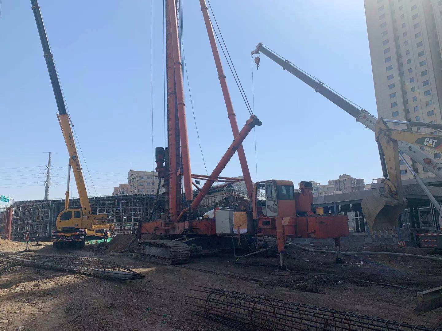 地下水文條件復(fù)雜,勘察期間場地地下水位歷史正常埋深為0.3-15.8m(場地內(nèi)局部已開挖接近坑底),由于電力隧道降水項目暫停,項目地下水位埋深13.6m,在基坑開挖和使用過程中本項目將采取降水措施。本項目基坑支護(hù)設(shè)計采用樁錨支護(hù)與放坡相結(jié)合的支護(hù)體系,豎向設(shè)置四排錨索。支護(hù)樁直徑為0.8m,間距1.4m,樁長為22m,錨索采用自成孔普通錨索。樁間及坡面設(shè)置鋼筋網(wǎng),并噴射強(qiáng)度為C20的混凝土面層,面層后80mm。本項目截止至2021年3月1日已完成降水系統(tǒng)施工,目前正在施工支護(hù)樁。