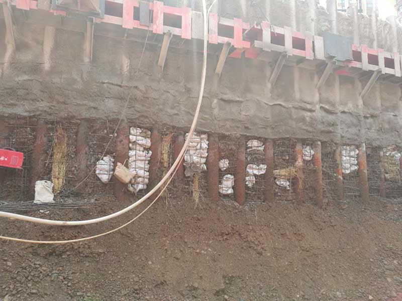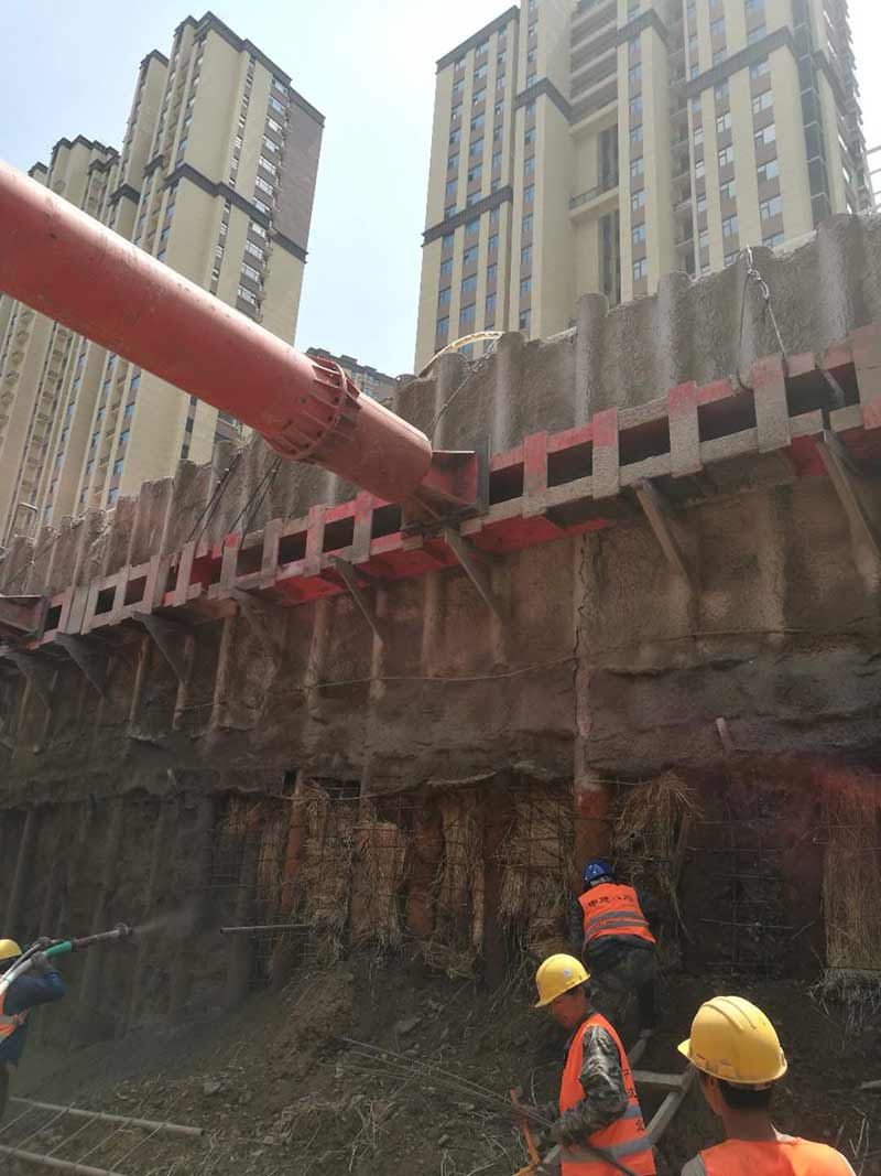 樁間噴護采用礦渣硅酸鹽水泥,標號為P.S42.5,噴射混凝土強度等級為C20,噴射厚度80mm,內置一層φ6.5@200鋼筋網。